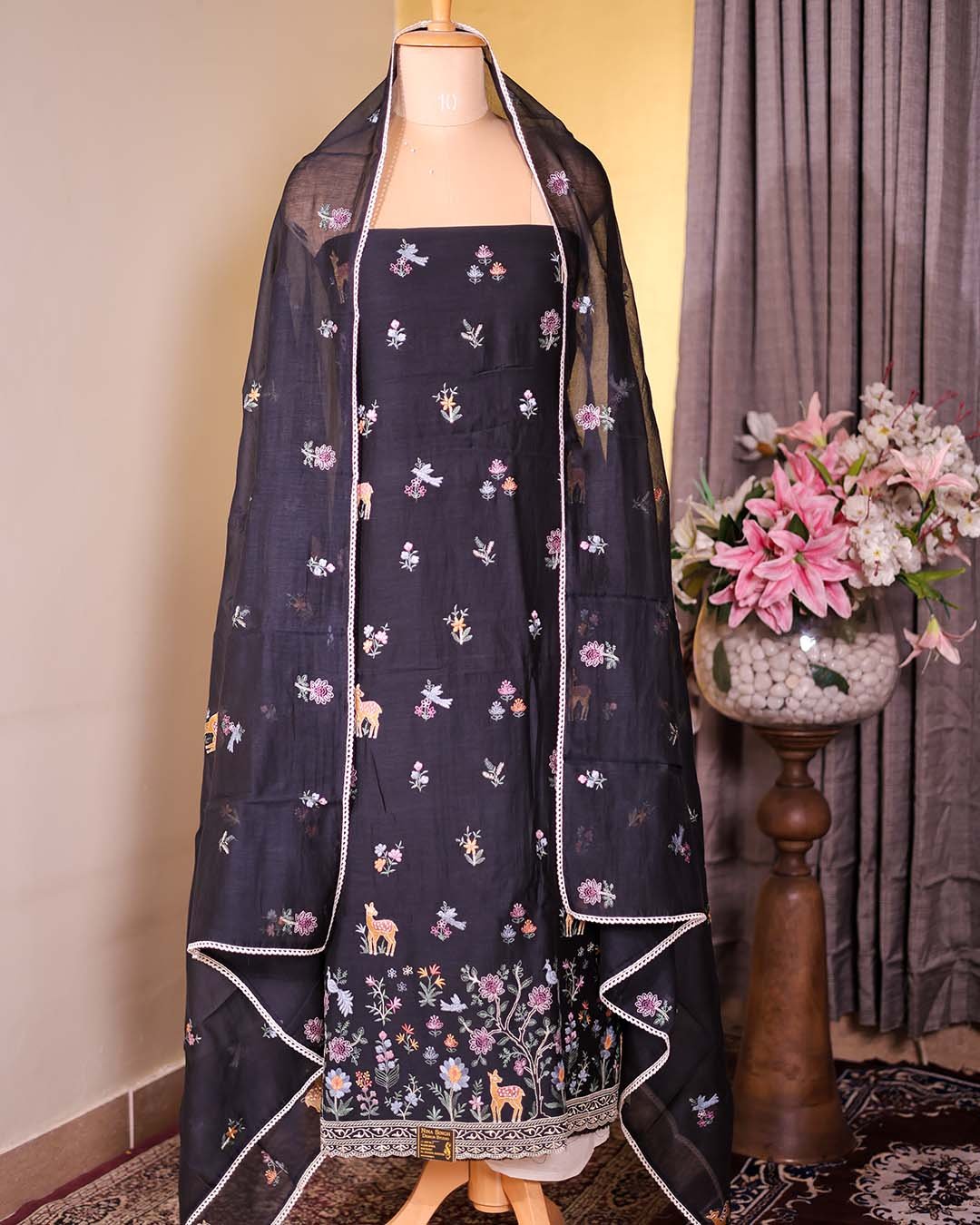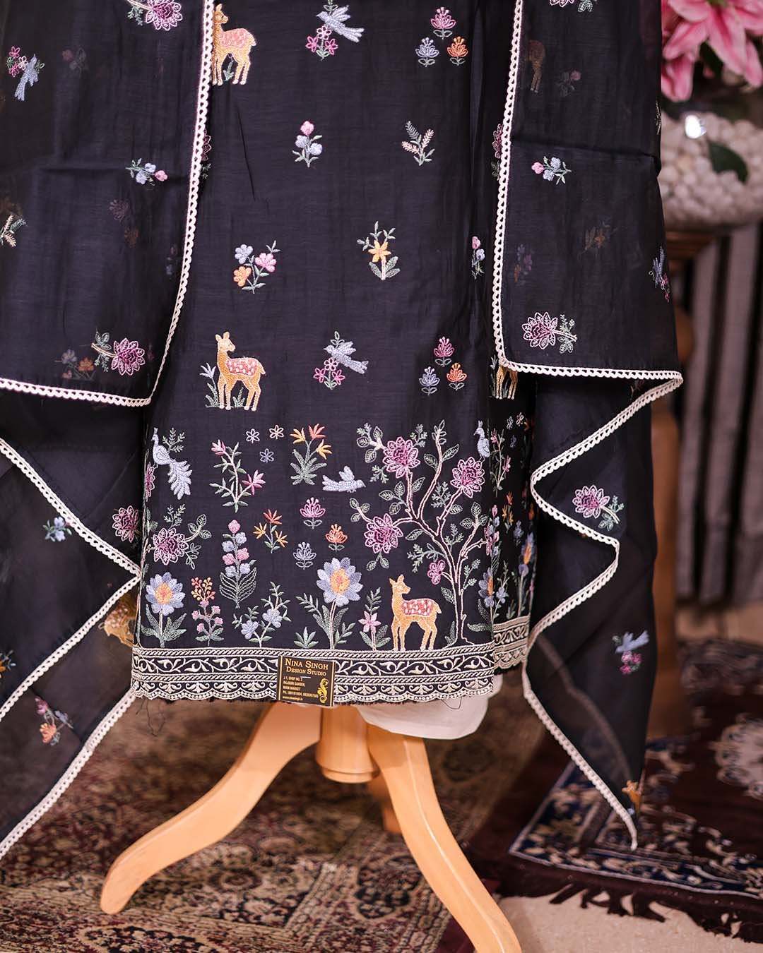 A black pure Mal suit featuring all-over floral and animal embroidery with a fully embroidered hemline and dupatta.