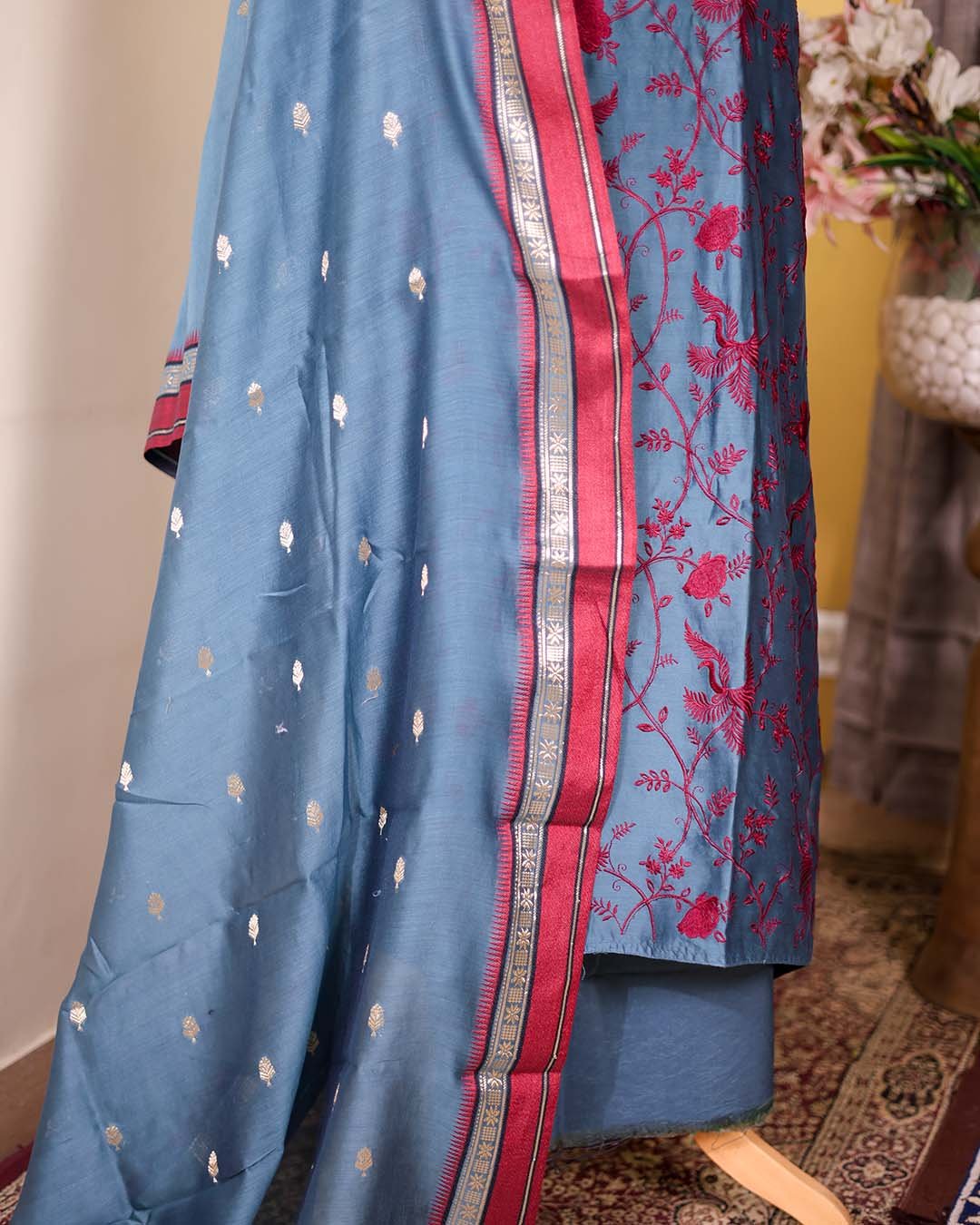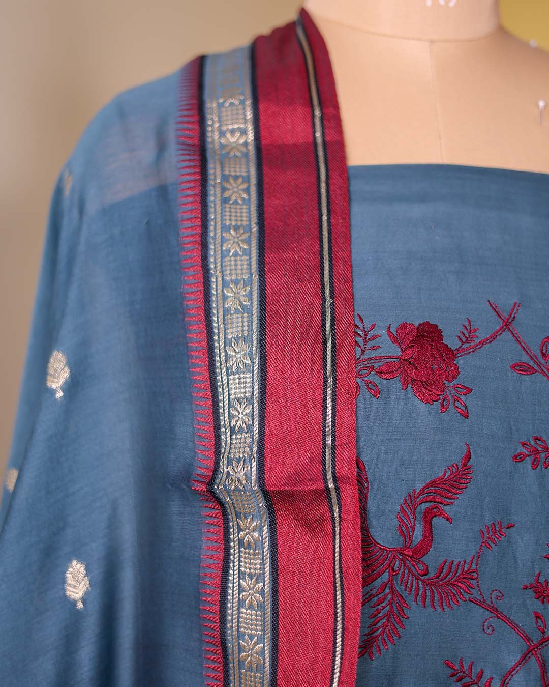 Blue Maheshwari Silk Suit with Maroon Thread Embroidery & Zari Booties