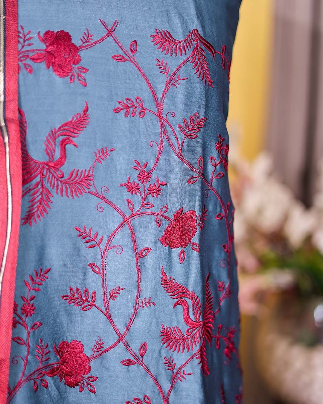 Crafted in elegant Maheshwari silk, this suit brings together classic weaving with refined embroidery. The shirt is detailed with maroon thread embroidery, complemented by delicate zari weaving booties that add subtle richness to the design.