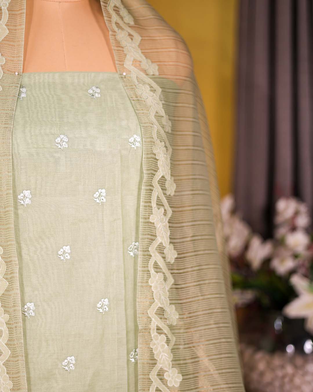 Green Mal Suit with Thread Bootis & Zari Striped Dupatta