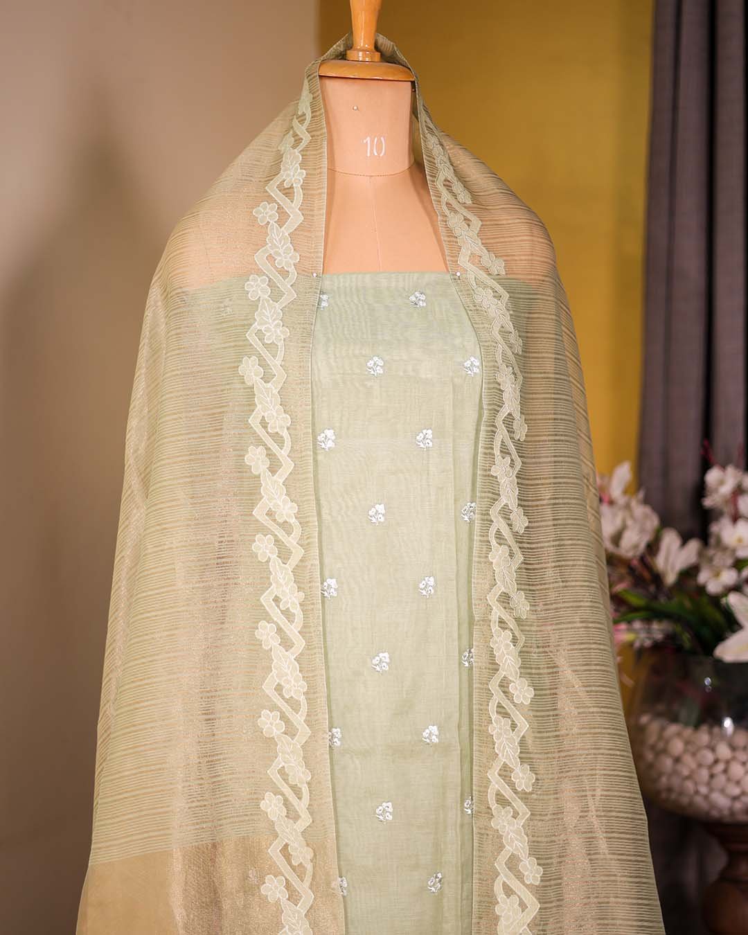 | Green Mal Suit with Thread Bootis & Zari Striped Dupatta remove | Green Pure Organza Bandhani with Hand Zardozi & Gota Patti remove | Crushed Tissue Suit with Floral Hand & Thread Embroidery - Peach remove | Maheshwari Silk Suit with Mirror & Thread-Embroidered Neckline remove | Rust Jamdani Suit with French Knot Detailing remove | Red Maheshwari Silk Suit with Batik Print remove | |