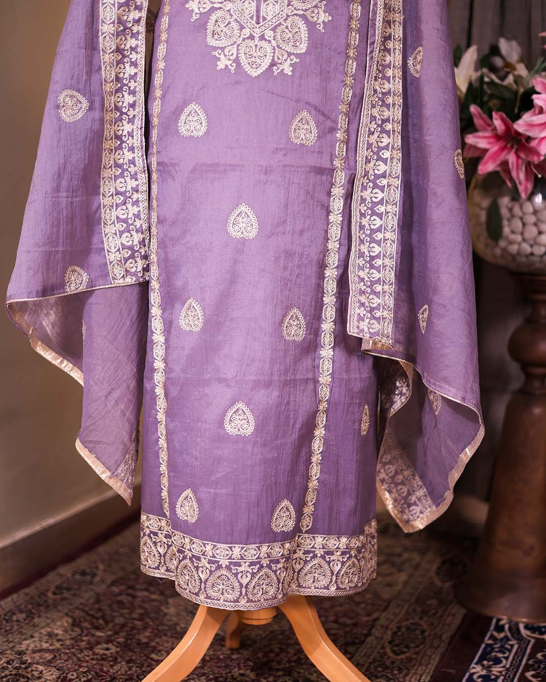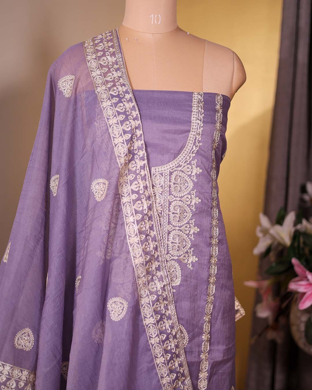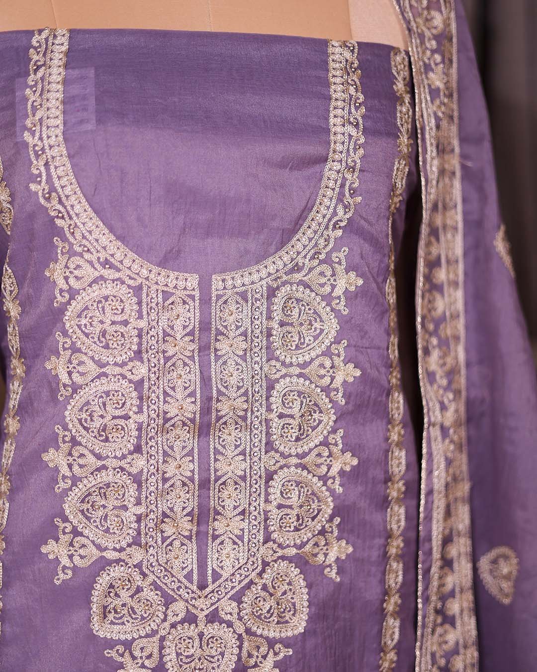 A mauve pure Mal festive suit featuring zari embroidery across the front, paired with a coordinated embroidered dupatta.