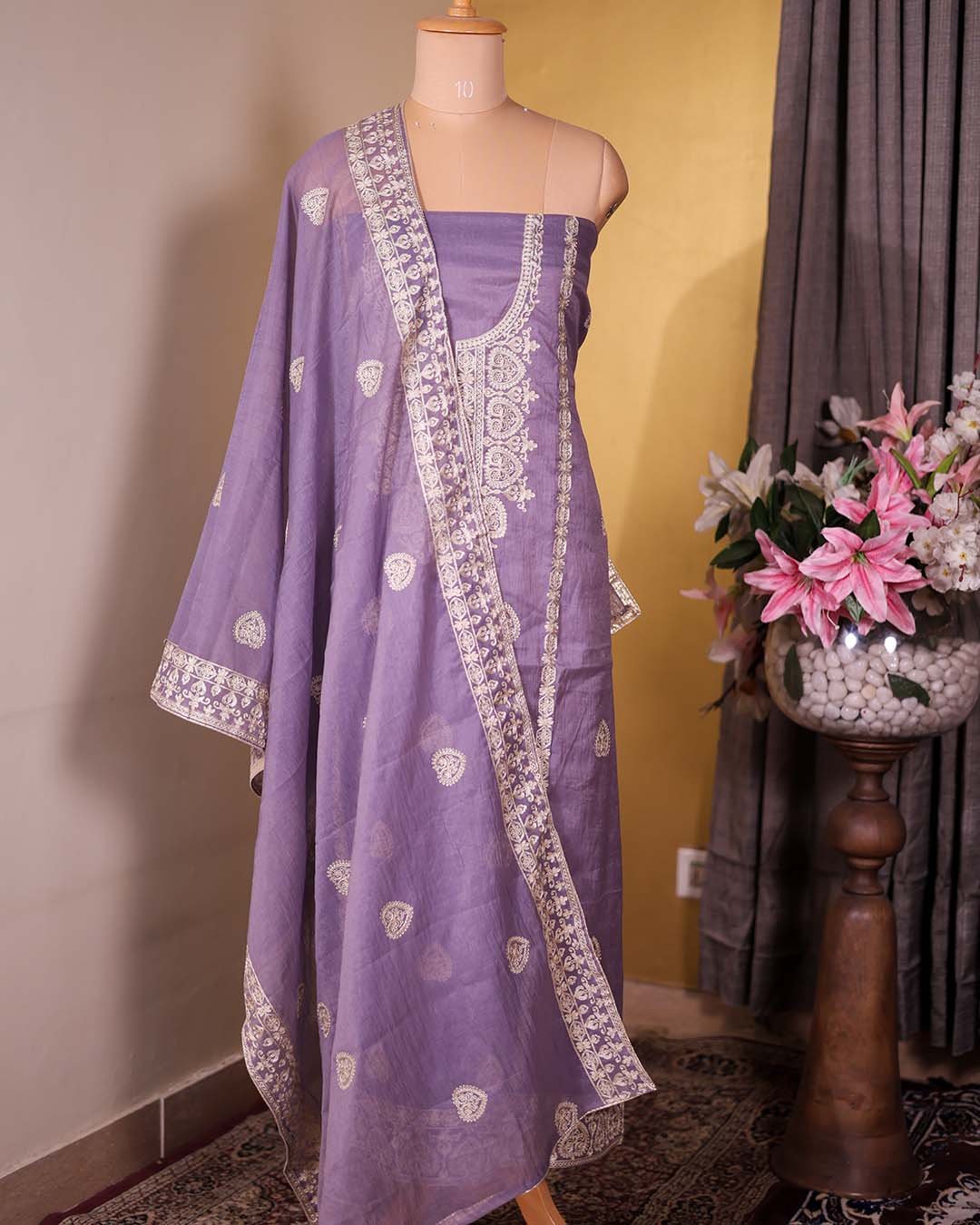 | Description | A mauve pure Mal festive suit featuring zari embroidery across the front, paired with a coordinated embroidered dupatta. | A soft pink summer silk suit featuring tonal appliqué work and a scalloped dupatta with coordinated corner motifs. | A semi-formal Maheshwari silk suit adorned with Banarasi zari booties, floral embroidered hemline, and an embroidered striped dupatta. | A refined black summer silk suit featuring tone-on-tone appliqué detailing at the neckline and a scalloped dupatta with corner motifs. | A graceful blue summer silk suit with tonal appliqué detailing and a scalloped dupatta accented with corner motifs. | A rich green silk suit detailed with hand zardozi dabka embroidery at the neckline, paired with a silk dupatta finished with lace accents. | ||