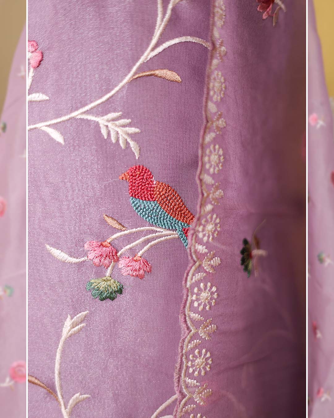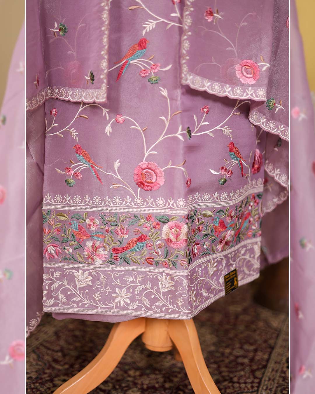 Crafted in luminous tissue fabric, this mauve festive suit highlights detailed Parsi jaal embroidery across the shirt, creating a rich yet graceful texture. The coordinating dupatta carries complementing embroidery, enhancing the overall elegance of the ensemble.