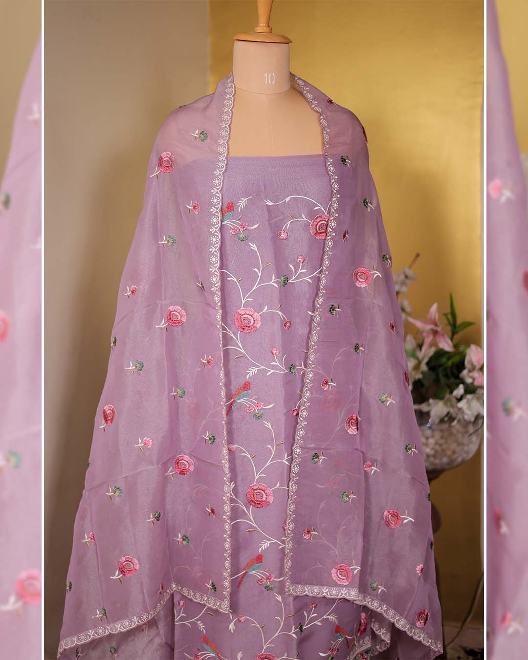 | Description | A festive mauve tissue suit featuring intricate Parsi jaal embroidery on the shirt and dupatta. | A refined black summer silk suit featuring tone-on-tone appliqué detailing at the neckline and a scalloped dupatta with corner motifs. | A refreshing green summer silk suit detailed with tonal appliqué and a scalloped dupatta featuring subtle corner motifs. | A graceful Maheshwari silk printed suit in a calming blue tone, paired with a maroon Banarasi border dupatta for a refined festive look. | A wine Maheshwari silk suit featuring classic block printing, paired with a dupatta enriched with kantha embroidery. | An elegant crushed tissue suit detailed with floral hand and thread embroidery, crafted for refined festive and occasion wear. |