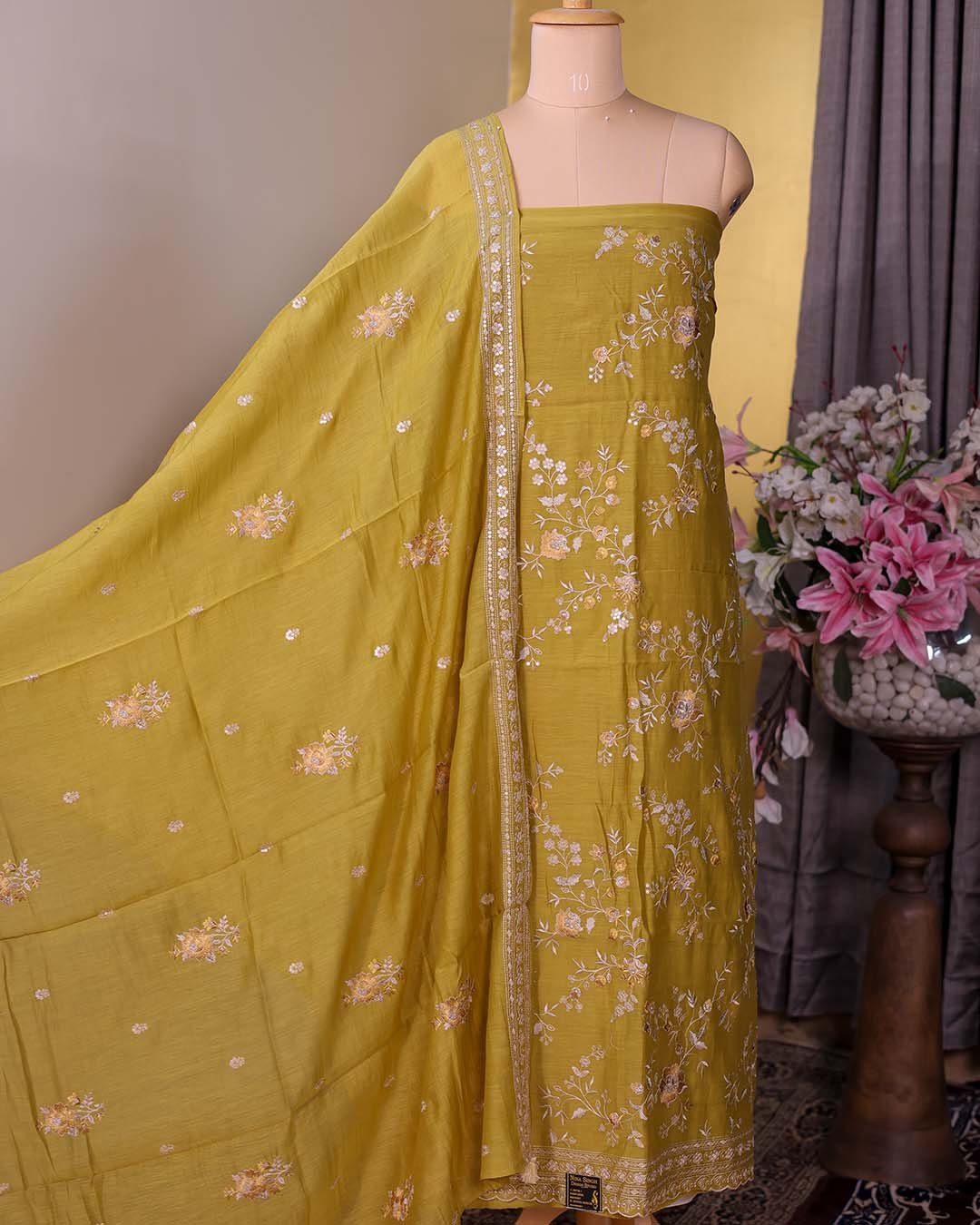 Mustard Pure Mal Suit with Thread, Sequin & Zari Embroidery