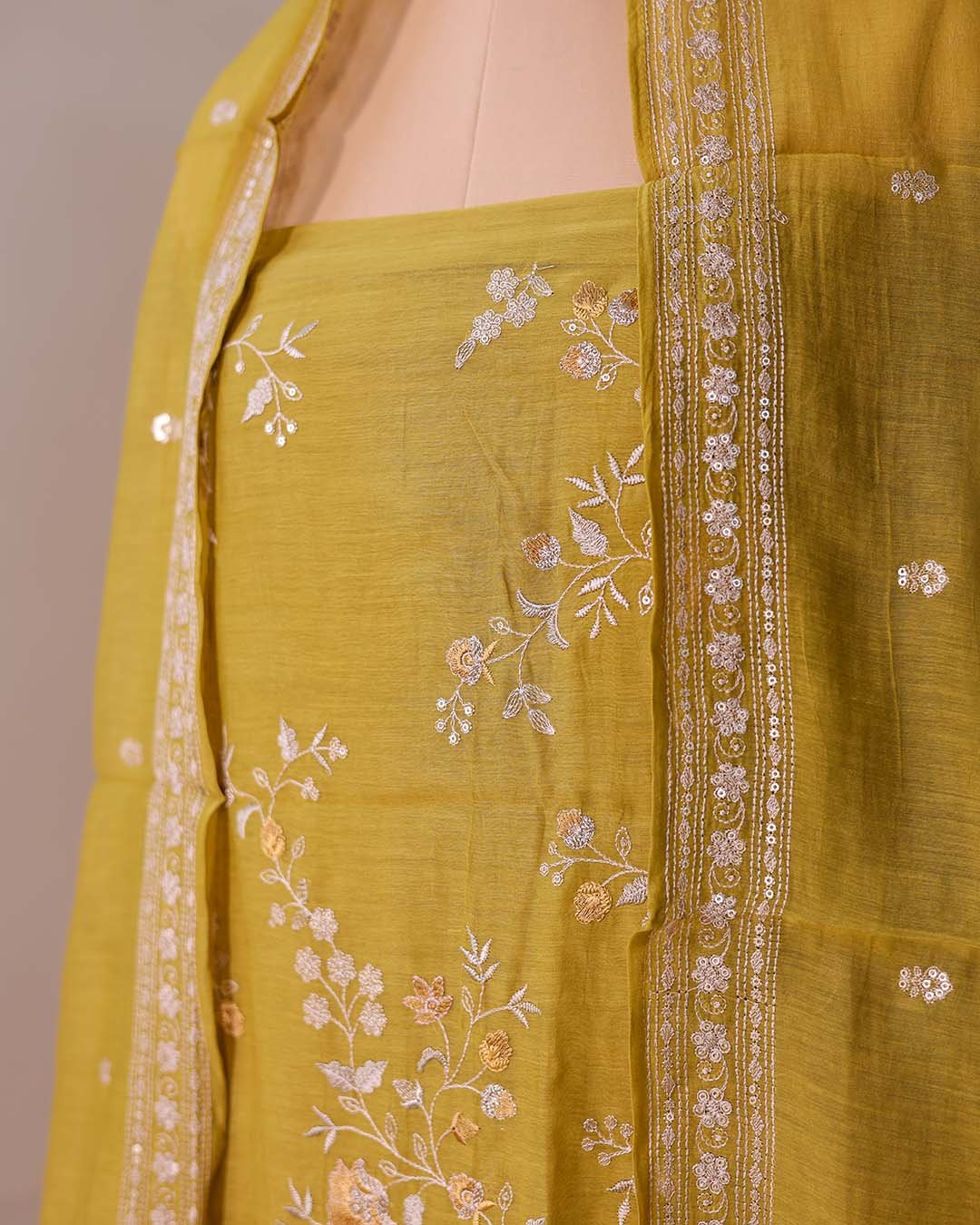 A lightweight pure Mal suit featuring thread, sequin and zari embroidery on the shirt, paired with a fully embroidered dupatta.