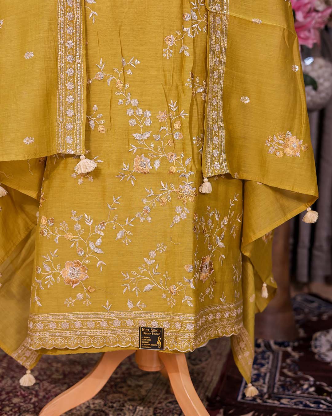 | Description | A lightweight pure Mal suit featuring thread, sequin and zari embroidery on the shirt, paired with a fully embroidered dupatta. | A classic Maheshwari silk printed suit in a rich maroon base, finished with Banarasi borders on the hemline and a contrasting blue dupatta. | A refreshing green summer silk suit detailed with tonal appliqué and a scalloped dupatta featuring subtle corner motifs. | A vibrant yellow pure organza Bandhani suit adorned with hand zardozi and gota patti work, paired with an embroidered organza dupatta. | A shimmer tissue suit featuring delicate appliqué work enhanced with fine thread embroidery, designed for graceful festive and occasion wear. | A refined yellow silk suit featuring a hand-embroidered zardozi dabka neckline, paired with a coordinated silk dupatta finished with lace detailing. |