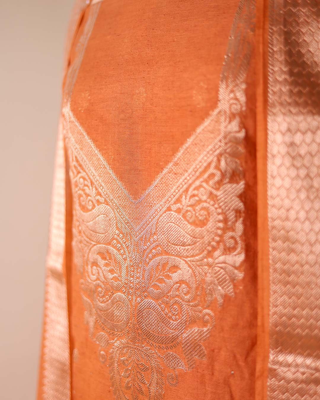 Crafted in lightweight summer silk, this suit blends traditional weaving with delicate hand detailing. The shirt features a Banarasi woven neckline and fine booties spread across the fabric, creating a rich yet balanced base.