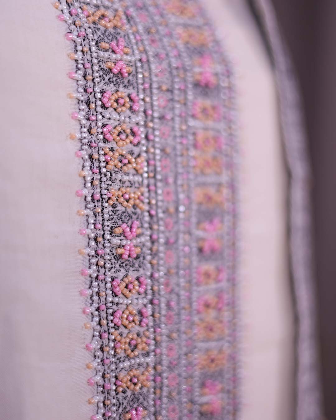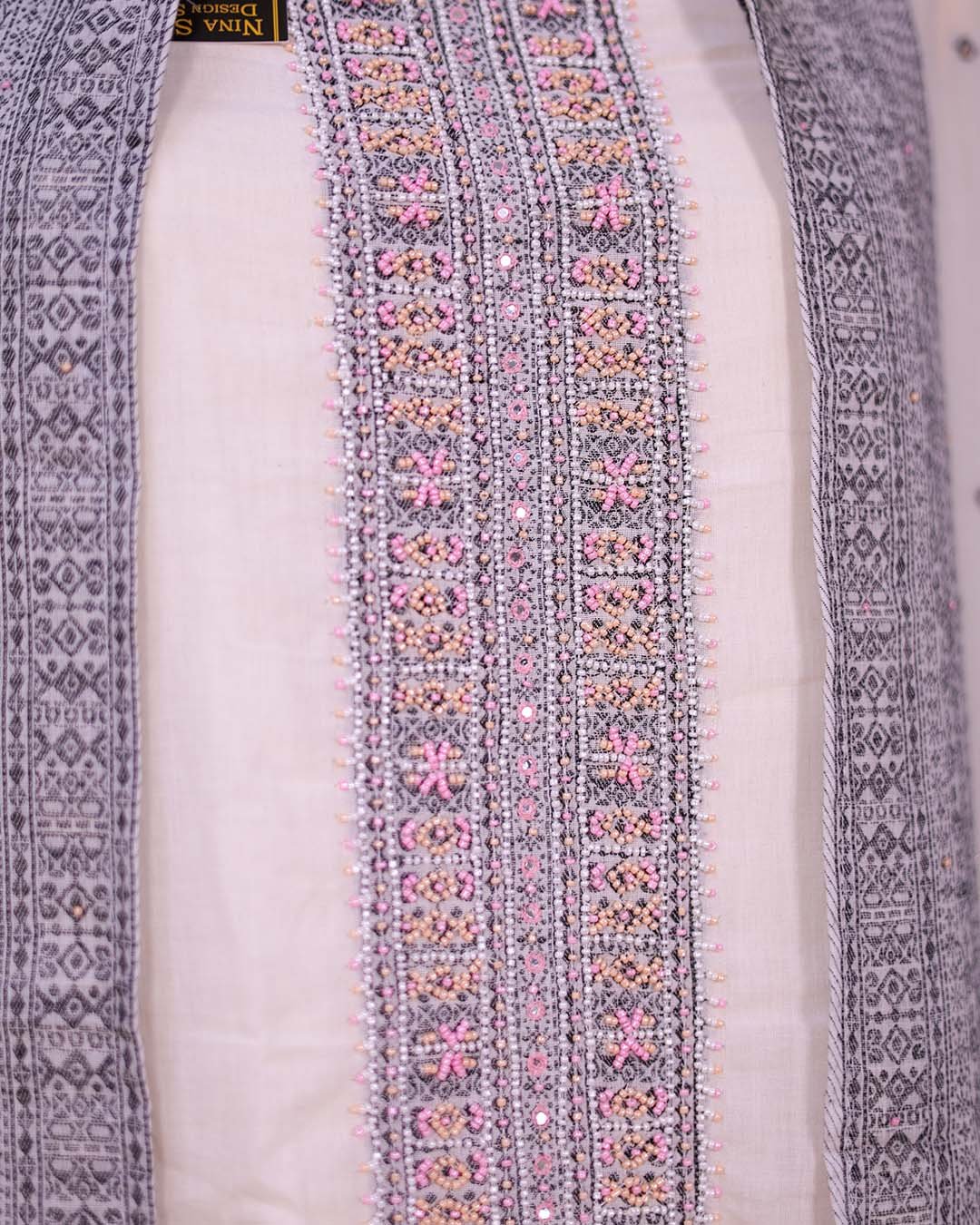 White Cotton Suit with Peach Beadwork & Weaving