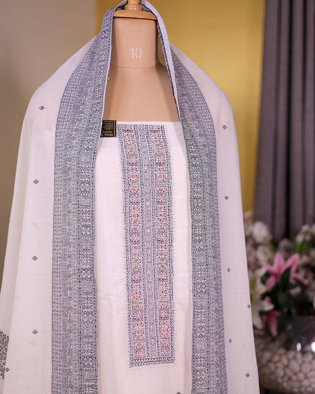 A lightweight white cotton suit featuring peach-toned beadwork on the neckline and hemline, paired with a dupatta with woven booties.