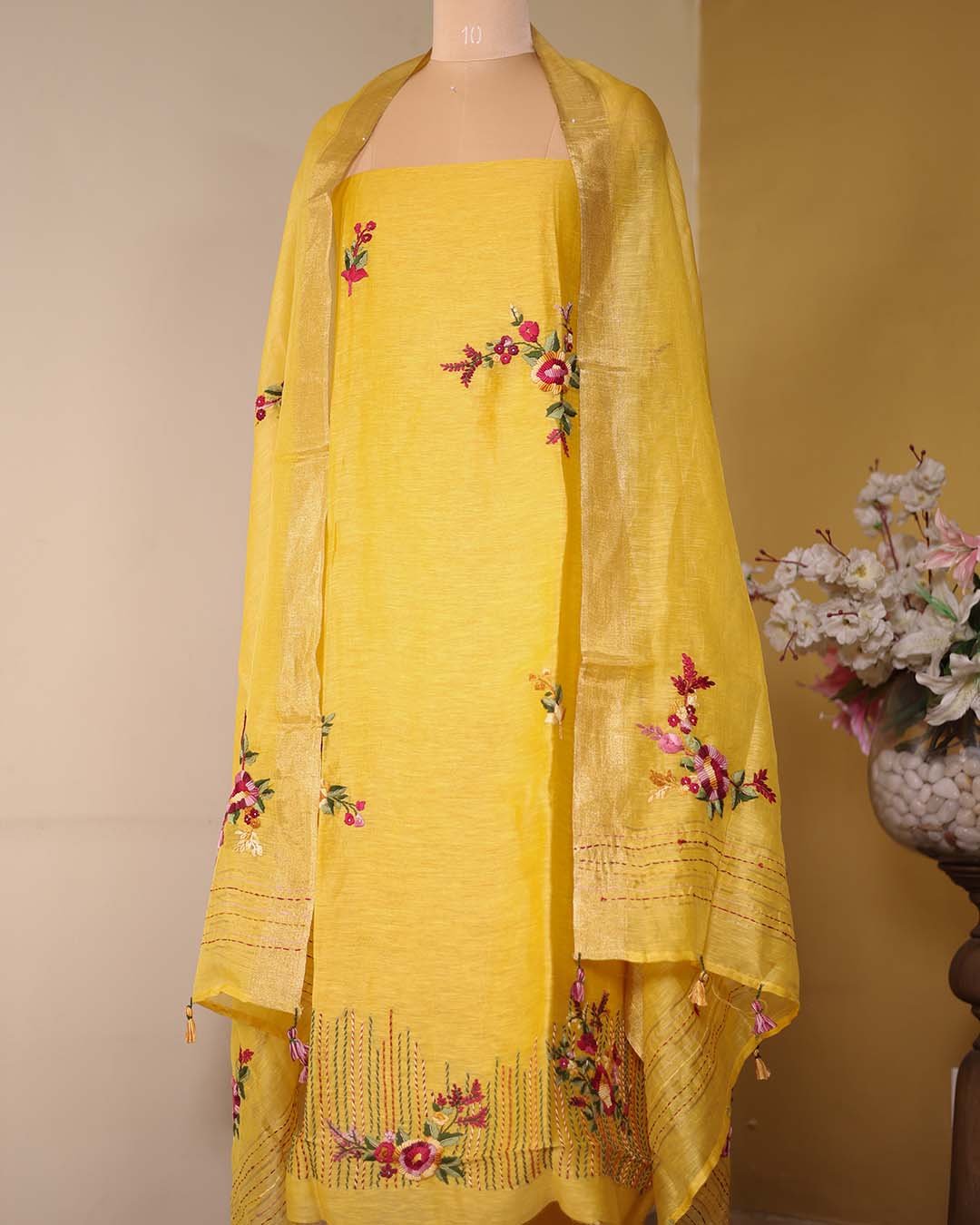 Yellow Silk Linen Suit with French Knot & Thread Embroidery