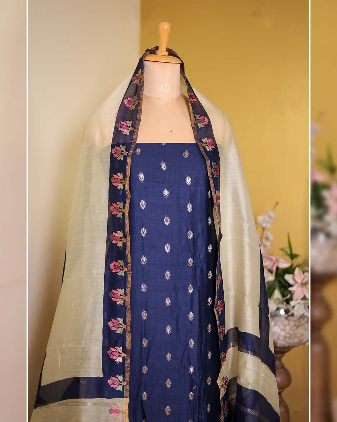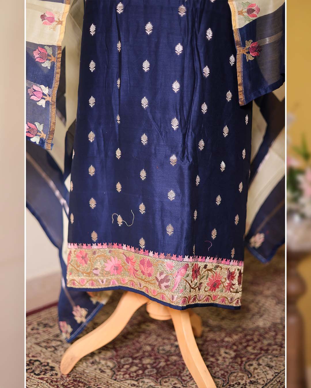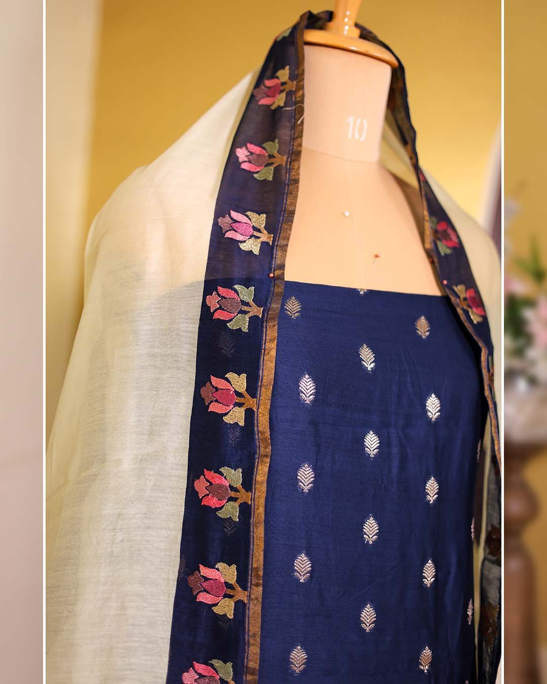 A semi-formal Maheshwari silk suit featuring Banarasi zari booties across the front, finished with floral embroidery on the hemline and paired with a striped embroidered dupatta.