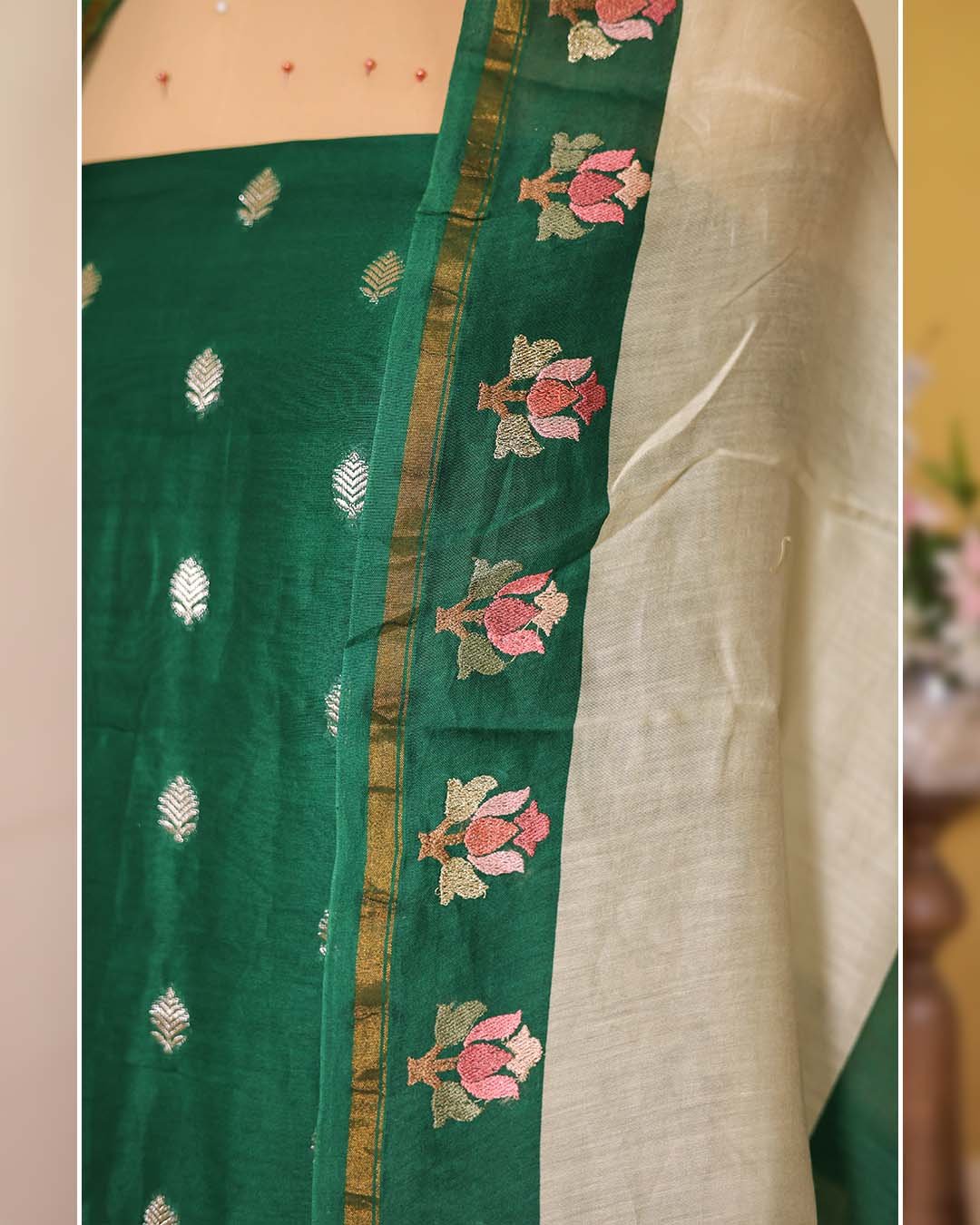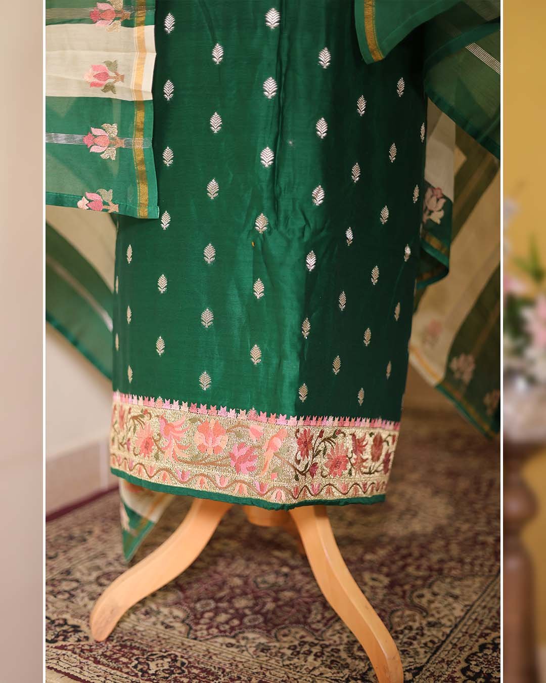 Green Maheshwari Silk Suit with Banarasi Zari Booties & Embroidered Dupatta