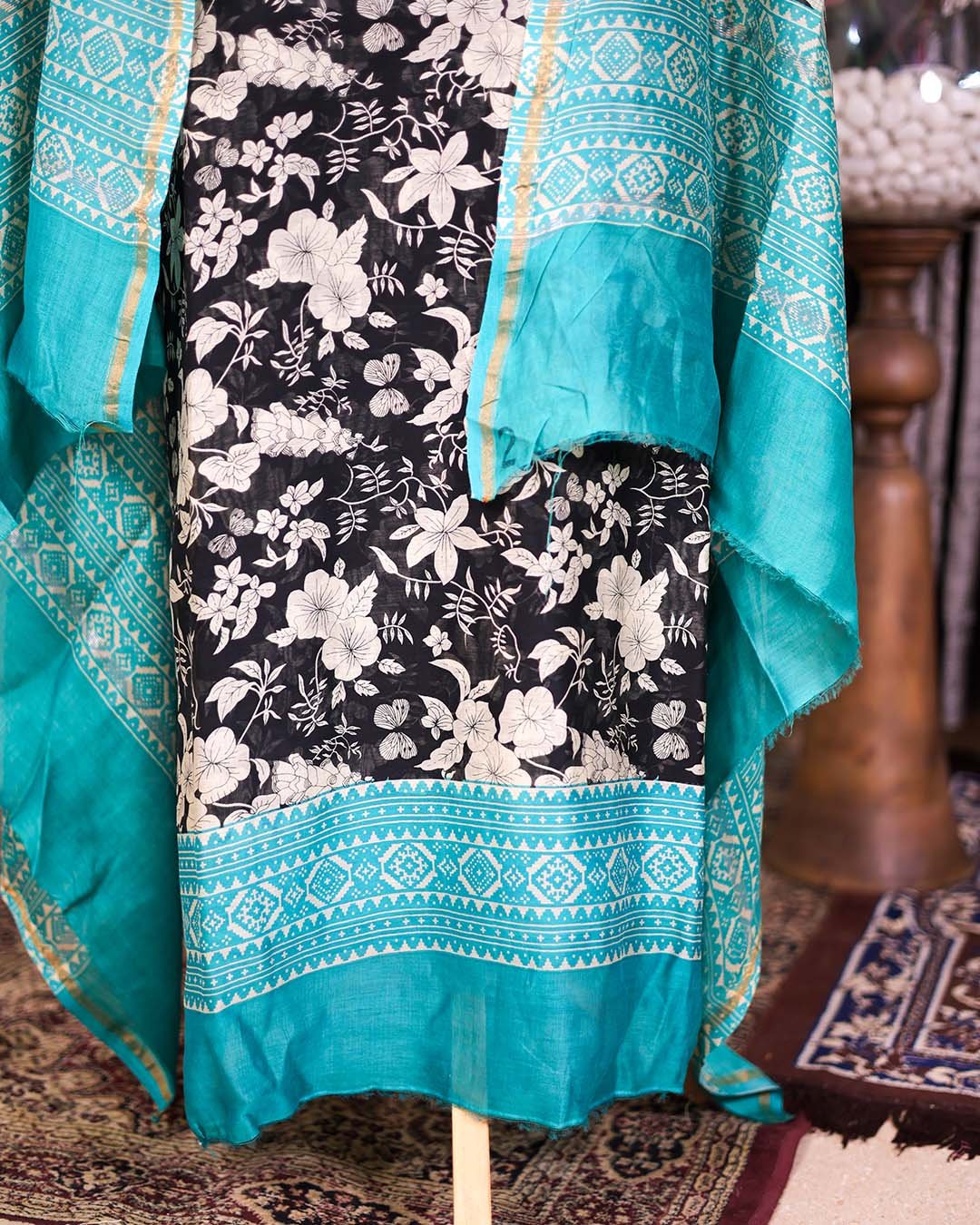 A Maheshwari silk suit featuring floral prints on the shirt, paired with a contrasting leheriya printed dupatta.