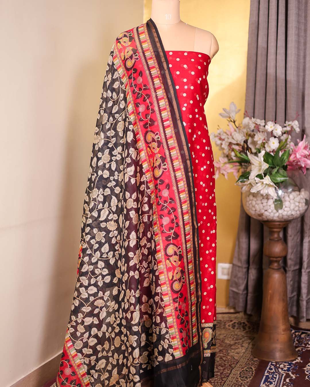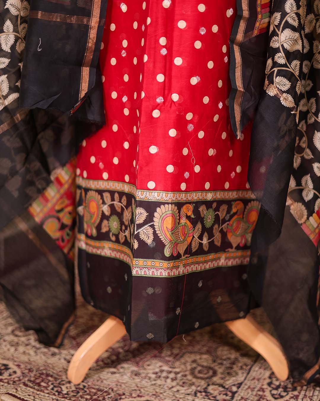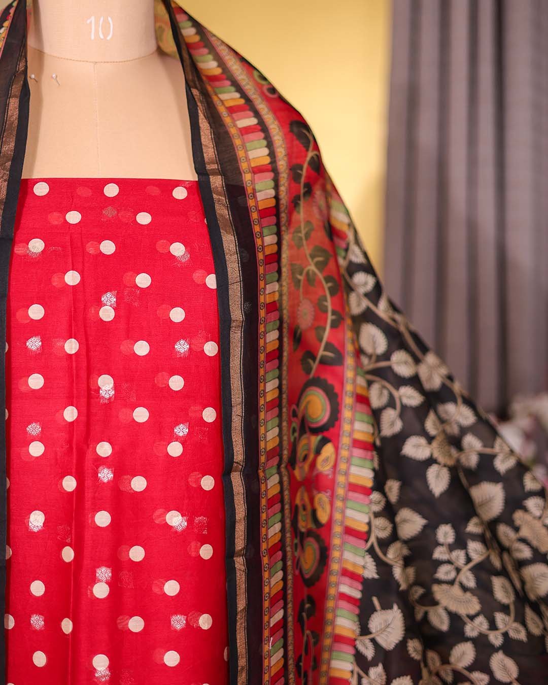 Red Maheshwari Silk Polka Suit with Zari Booties & Leaf Print Dupatta