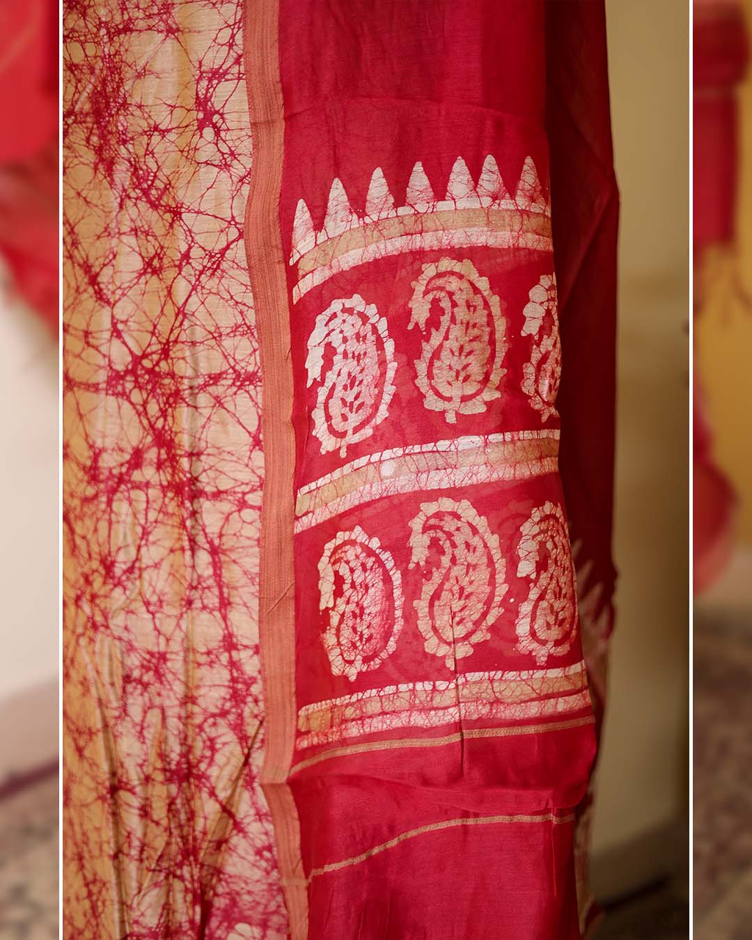 The coordinated dupatta carries the same batik detailing, bringing harmony to the ensemble. Lightweight and easy to carry, the natural sheen of Maheshwari silk enhances the depth of the print while maintaining elegance.
