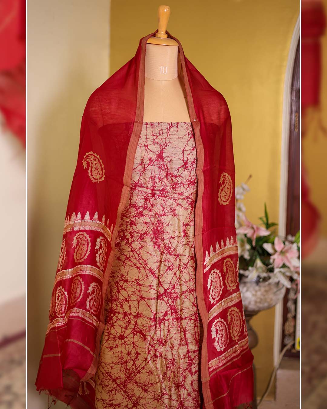 A red Maheshwari silk suit featuring all-over batik print, paired with a coordinated dupatta in matching batik design.