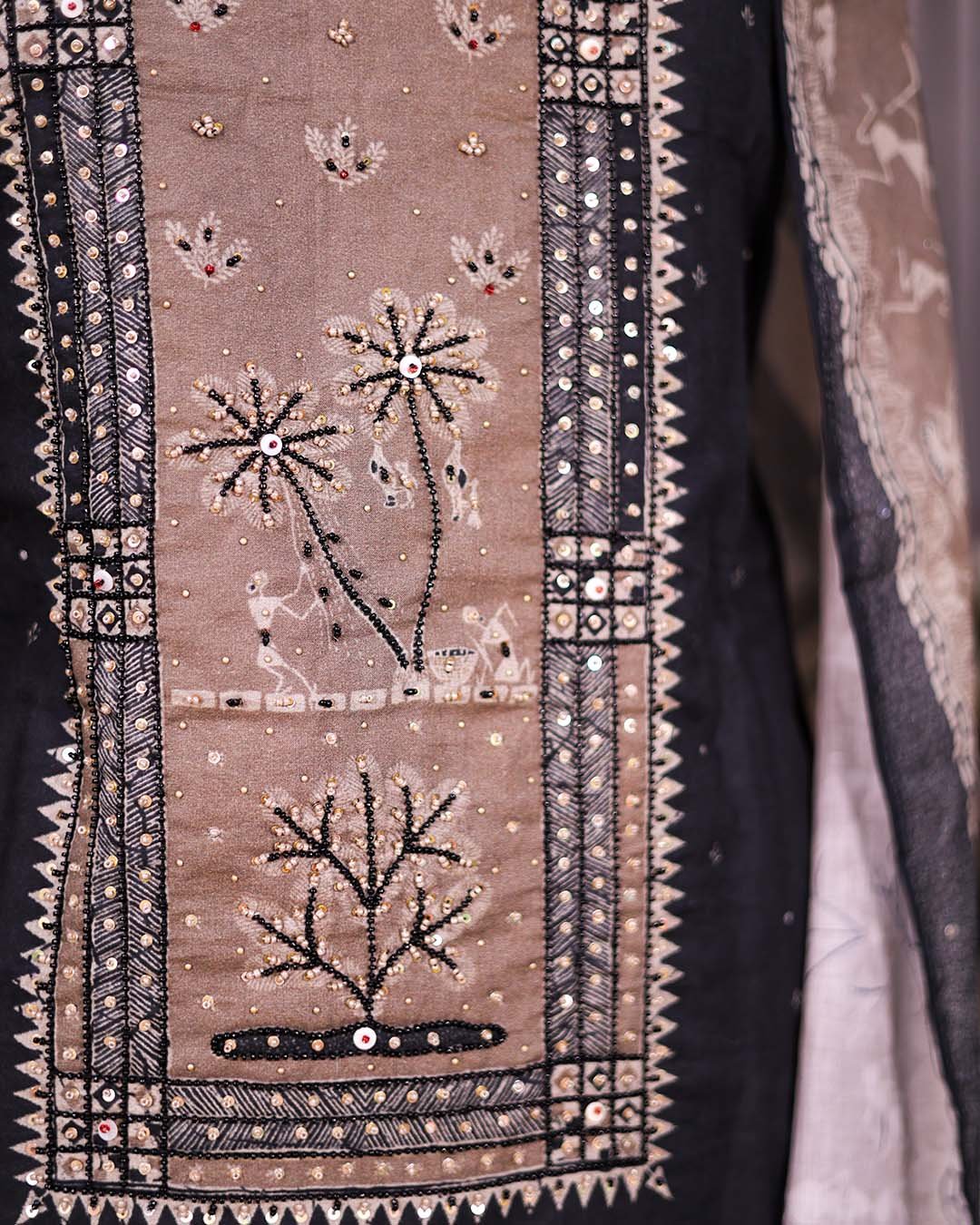 Black Cotton Suit with Kalp Vriksh Print & Beaded Neckline