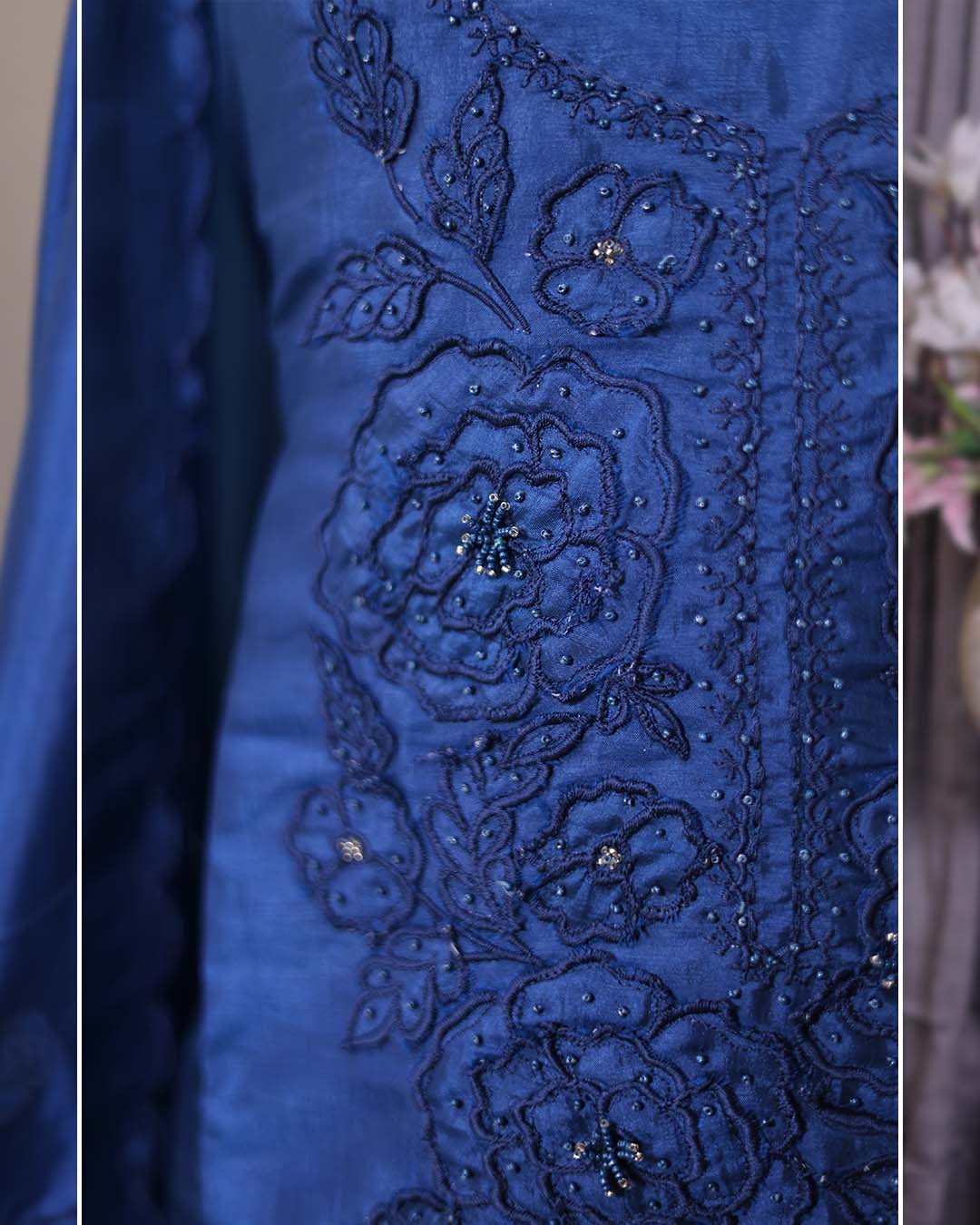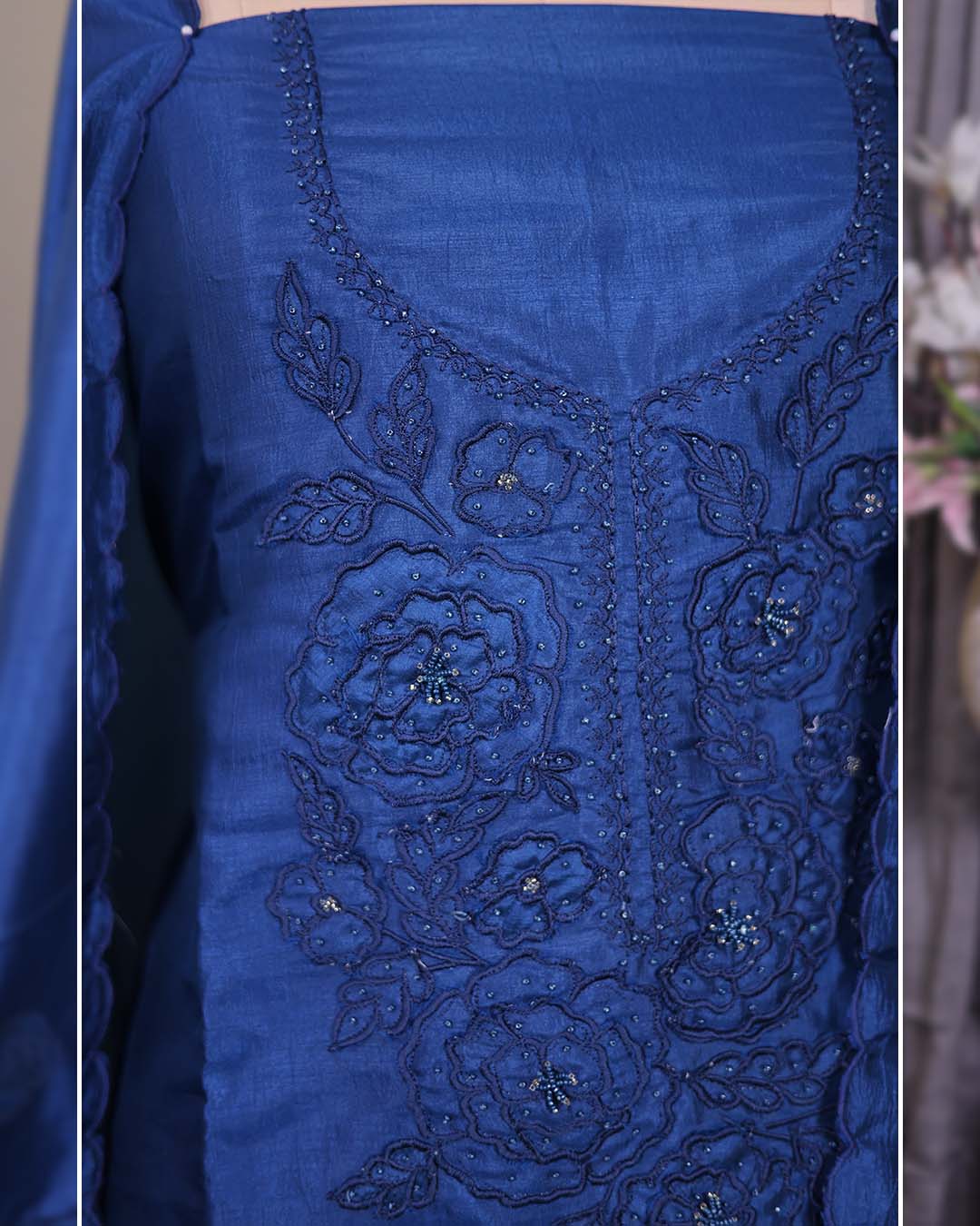 Designed for semi-formal settings, this summer silk suit features delicate tone-on-tone appliqué work at the neckline for a refined finish. The dupatta carries coordinating appliqué motifs at the corners and is completed with scalloped edging along all sides.