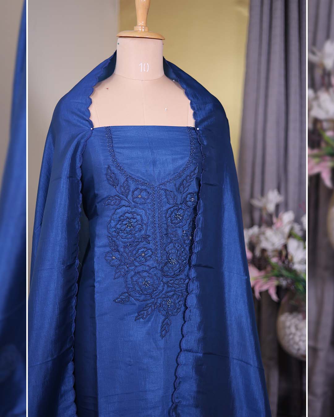 A graceful blue summer silk suit with tonal appliqué detailing and a scalloped dupatta accented with corner motifs.