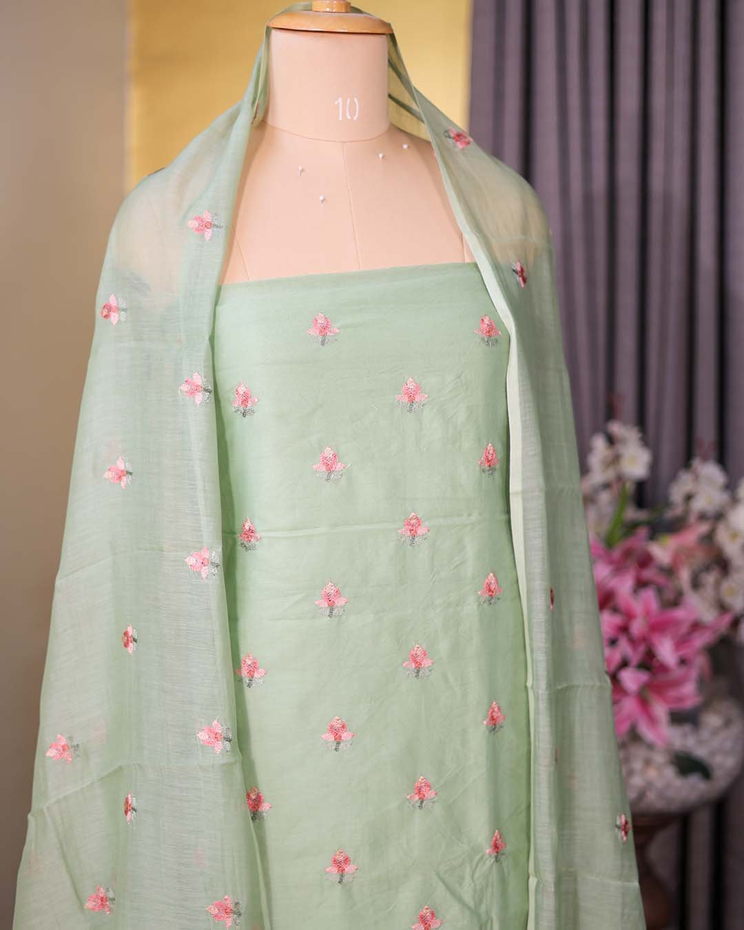 A lightweight Mal Chanderi suit featuring floral bootis across the shirt and dupatta, finished with floral embroidery on the hemline and dupatta.