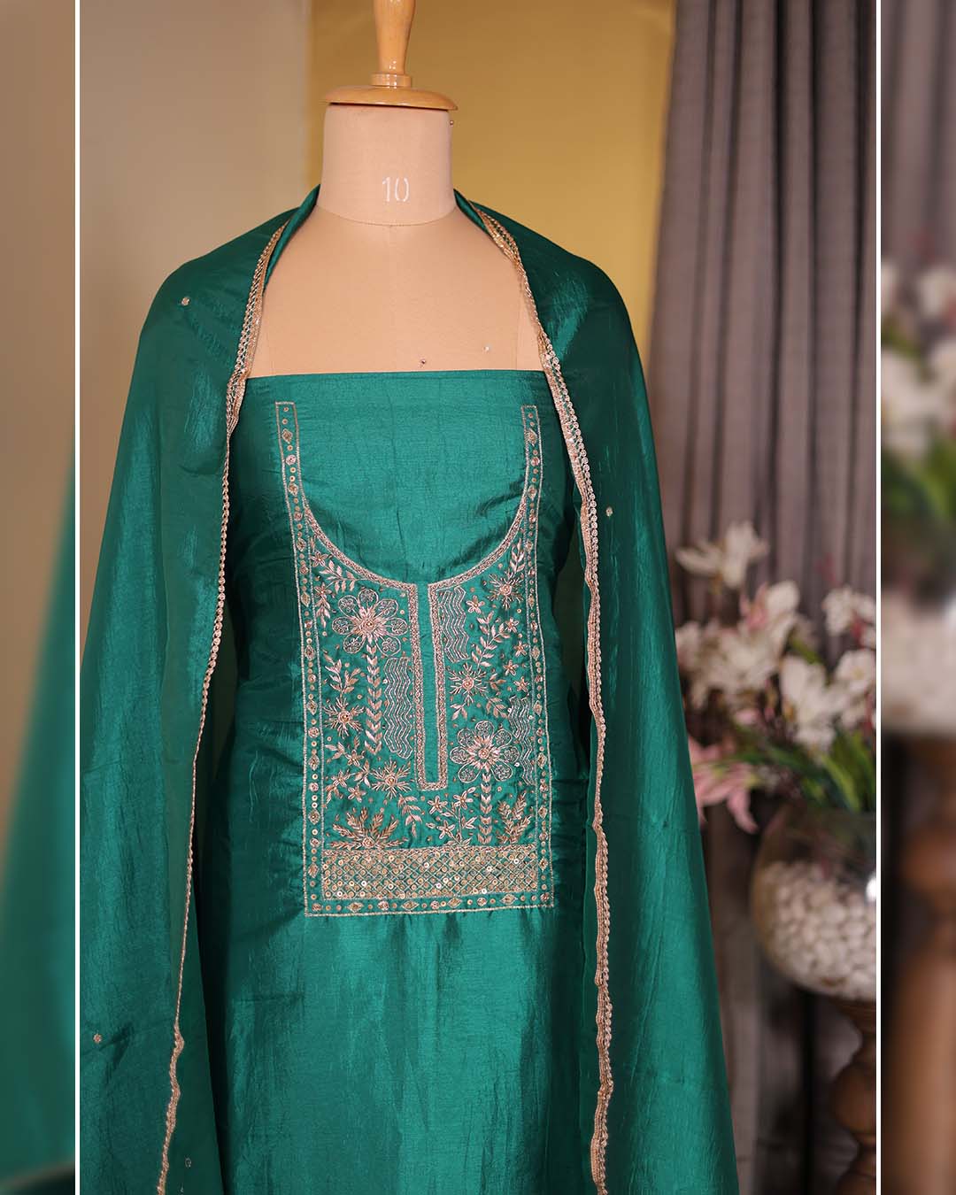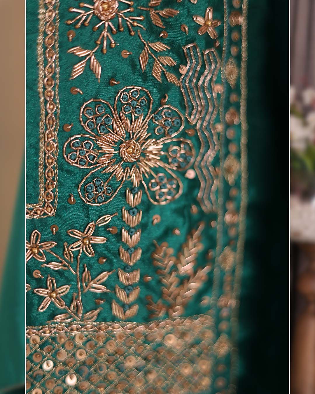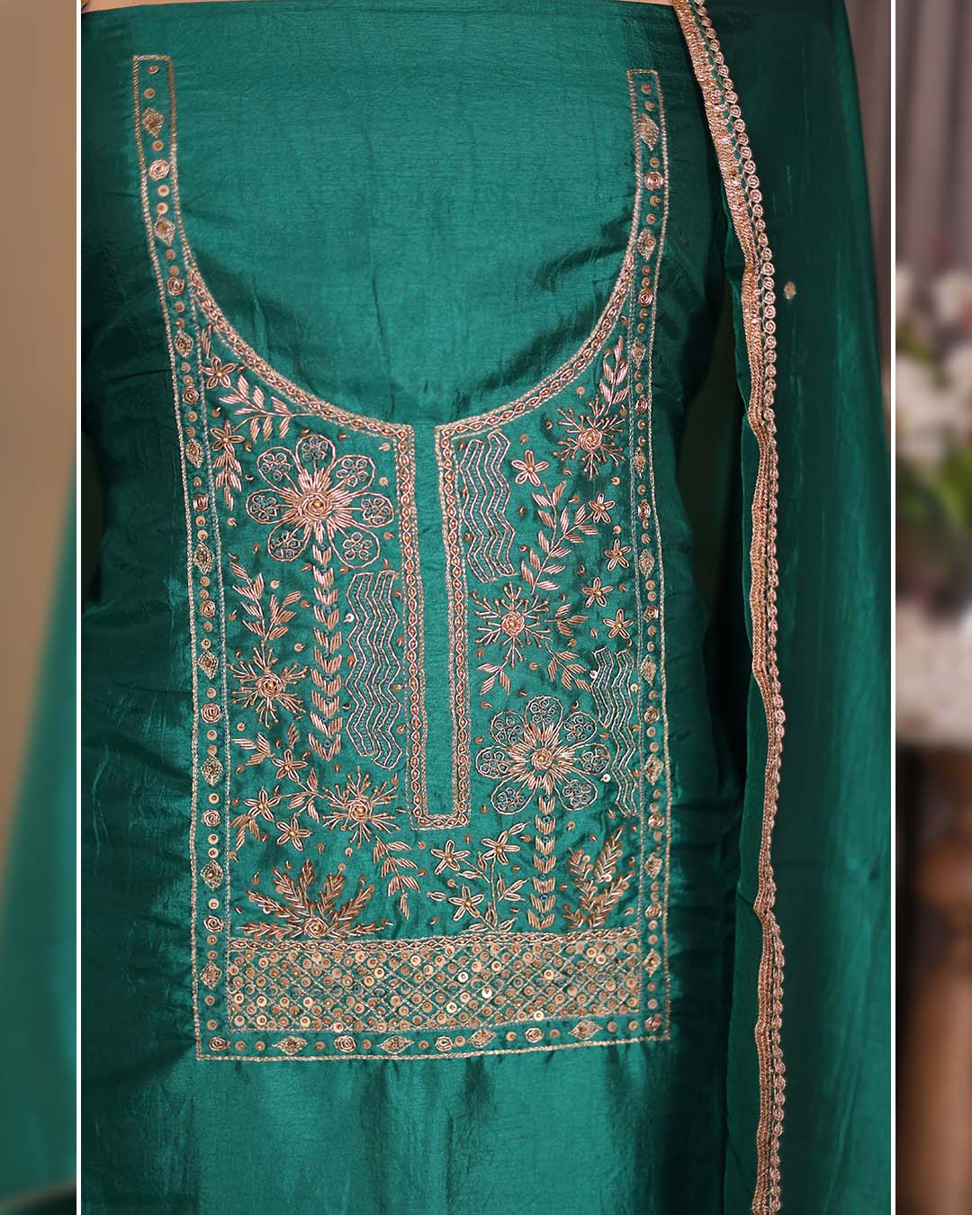 This green silk suit set blends classic silk with refined hand craftsmanship. The neckline is adorned with hand-embroidered zardozi dabka work, creating a statement while maintaining a balanced semi-formal appeal.