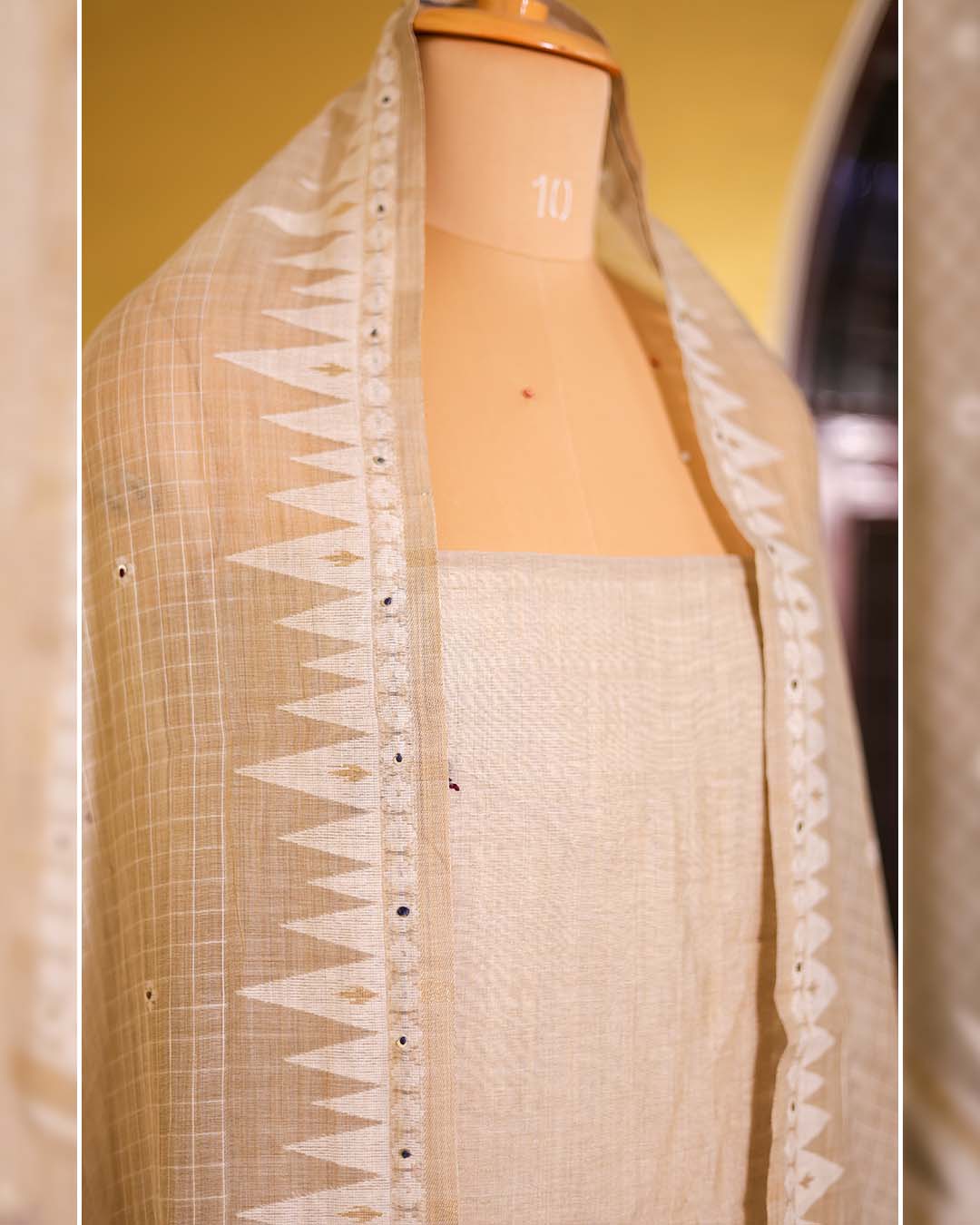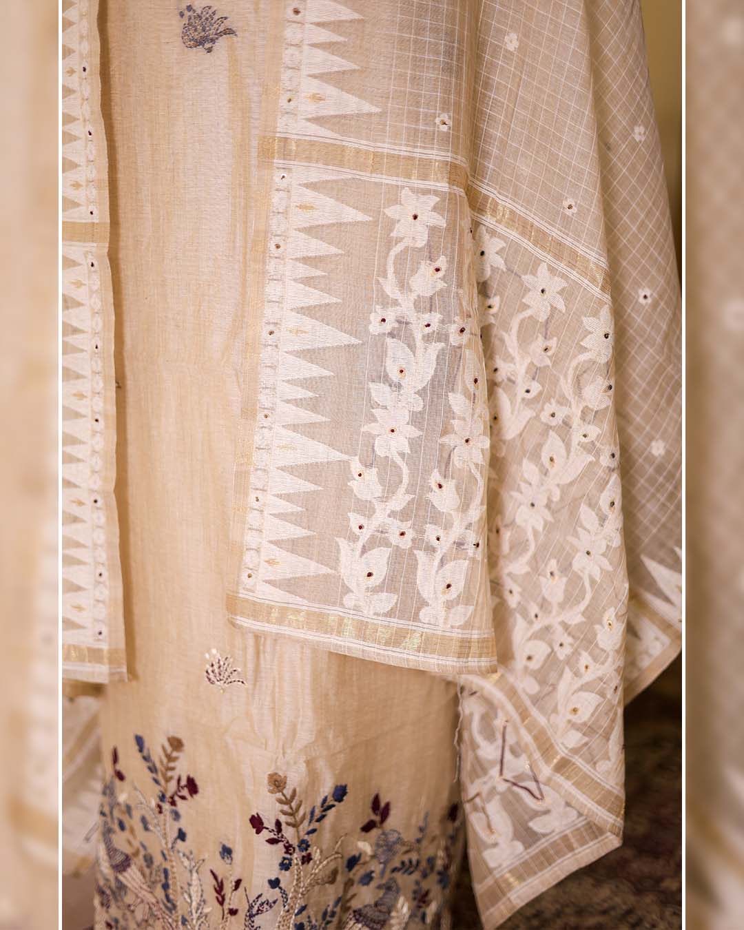The dupatta features a delicate self-weaving design and is finished with fine zari weaving borders, lending structure and quiet richness to the ensemble.