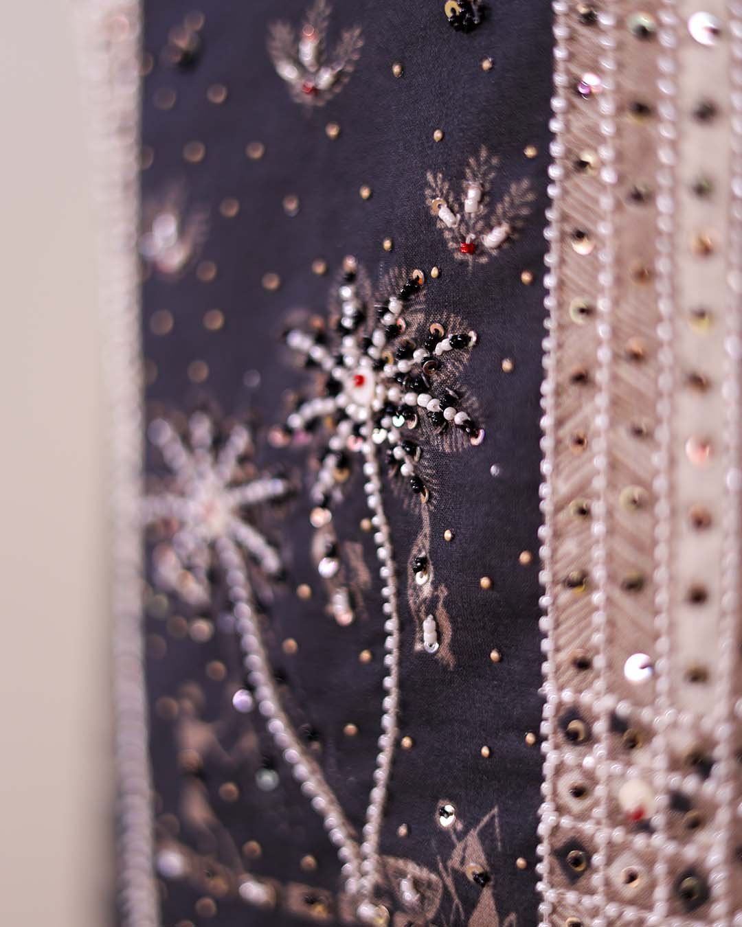 The neckline is highlighted with delicate hand-done bead embroidery, adding subtle texture and refinement to the printed base.