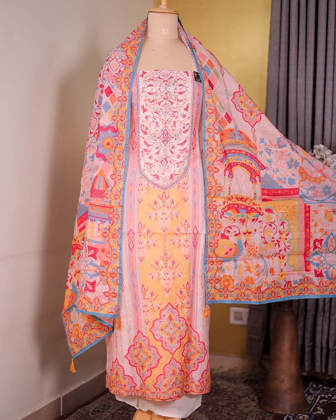 | Description | A vibrant digital print suit featuring hand-done beadwork on the neckline for a refined finish. | A refined yellow silk suit featuring a hand-embroidered zardozi dabka neckline, paired with a coordinated silk dupatta finished with lace detailing. | A semi-formal Maheshwari silk suit featuring Banarasi zari booties across the front, finished with floral embroidery on the hemline and paired with an embroidered striped dupatta. | A semi-formal georgette tissue printed suit featuring delicate beadwork on the neckline, paired with a printed dupatta finished with zari borders. | A refreshing green summer silk suit detailed with tonal appliqué and a scalloped dupatta featuring subtle corner motifs. | A soft pink summer silk suit featuring tonal appliqué work and a scalloped dupatta with coordinated corner motifs. |