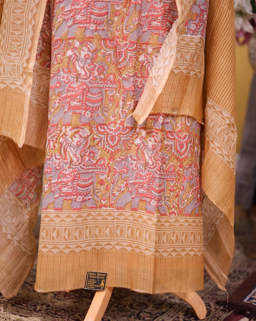 A lightweight pure Mal suit featuring traditional Kalamkari print on the shirt and dupatta.