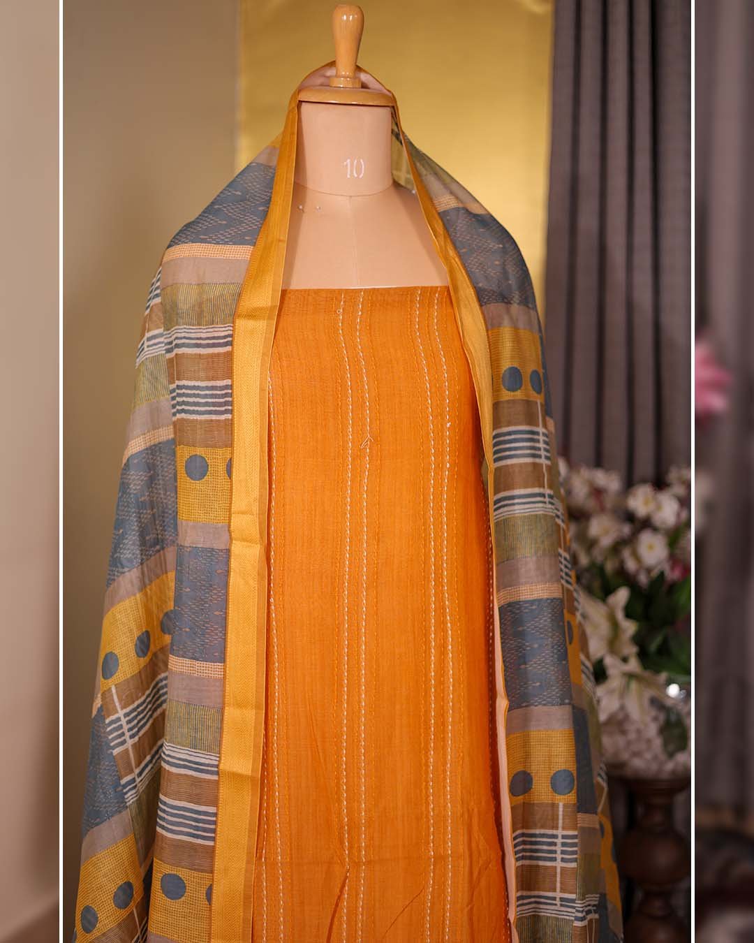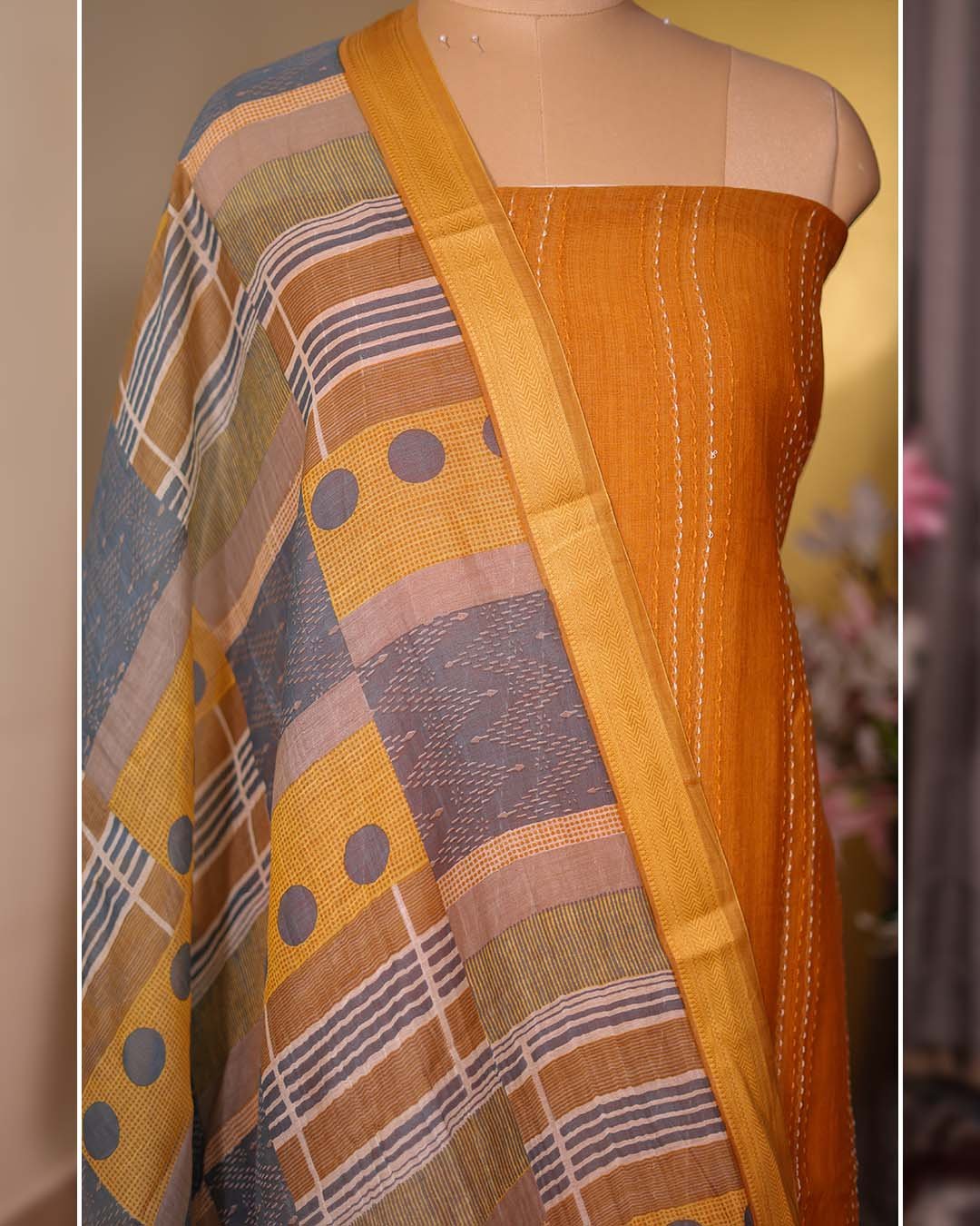 A vibrant burnt orange pure mal suit featuring Kantha work in vertical stripes, paired with a coordinating printed dupatta. Lightweight, breathable, and perfect for summer wear.