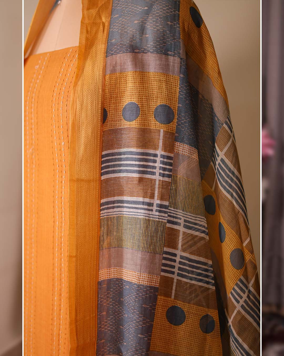 The shirt is beautifully enhanced with Kantha work arranged in vertical stripes, adding texture and subtle craftsmanship to the design. Vertical patterns create an elegant look while keeping the outfit visually balanced. The suit is paired with a printed dupatta that complements the embroidery and adds movement to the overall ensemble.