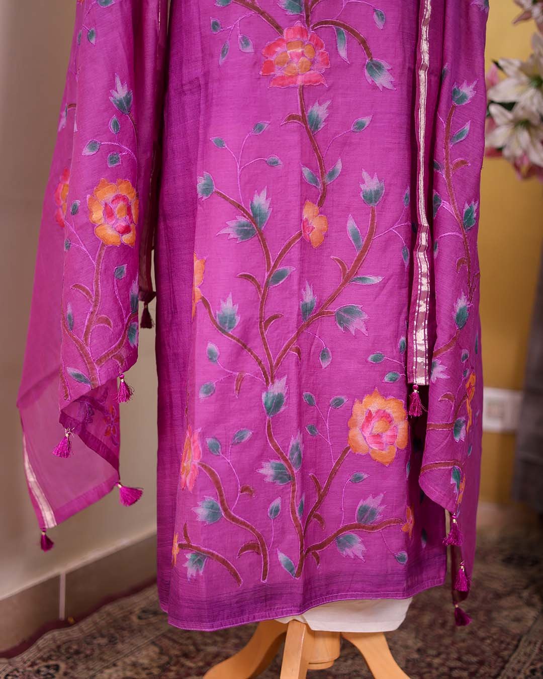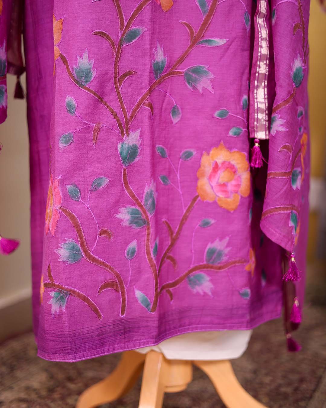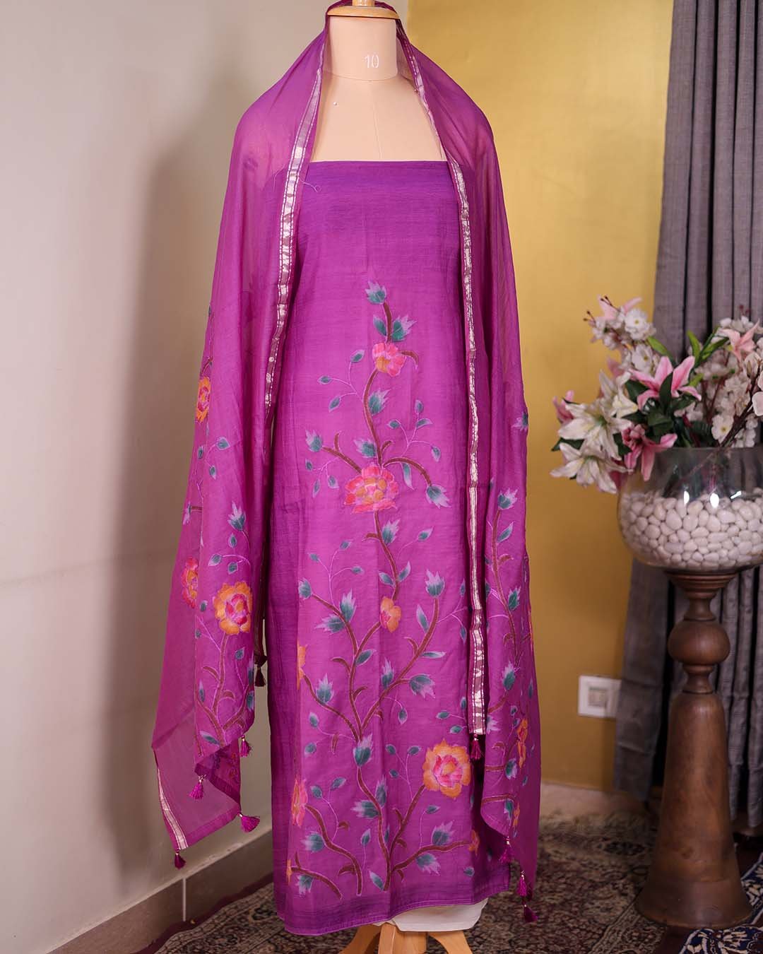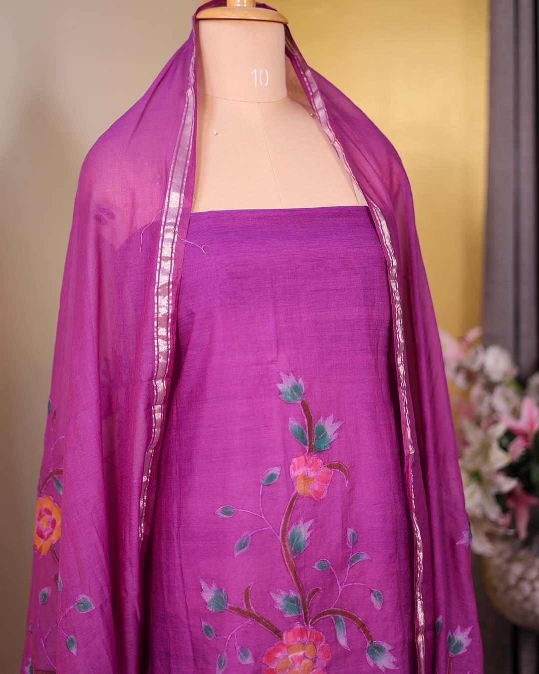 A purple pure Mal Chanderi suit featuring hand-painted detailing with appliqué work, paired with a coordinated dupatta.