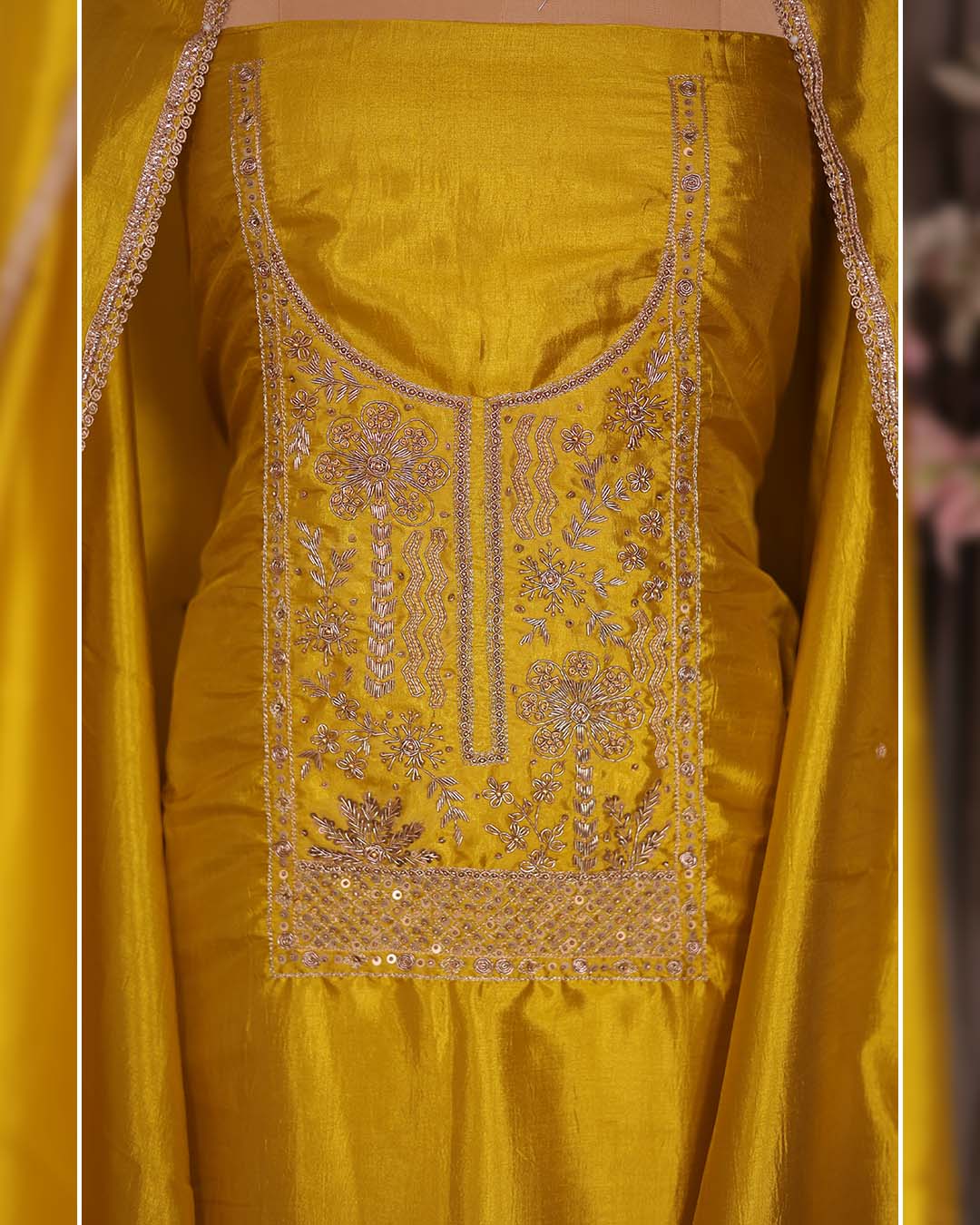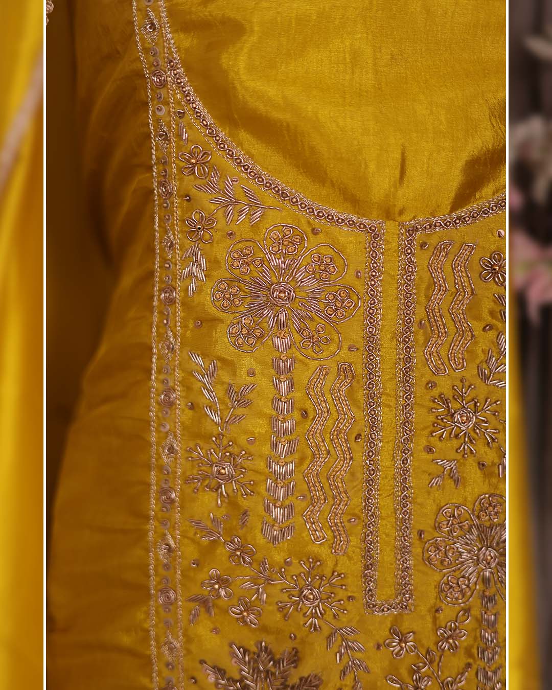 Yellow Silk Suit with Hand Zardozi Dabka Neckline