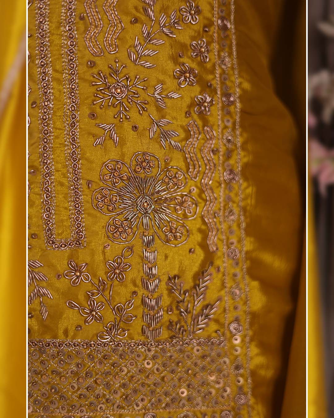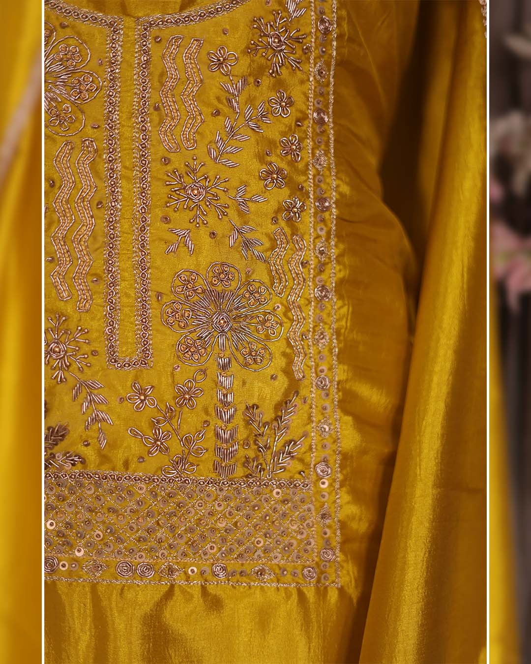 This yellow silk suit set is designed for semi-formal occasions that call for understated elegance. The shirt features intricate hand zardozi dabka work along the neckline, adding depth and traditional craftsmanship without overwhelming the silhouette.
